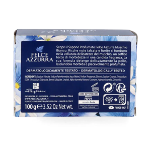 Felce Azzurra săpun solid Mosc Alb este realizat pe o bază de ingrediente vegetale și este creat pentru o curățare blândă a pielii. Profilul său aromatic este centrat pe nota de mosc alb, cu accente florale și pudrate, pentru o senzație de curățenie elegantă și de lungă durată.